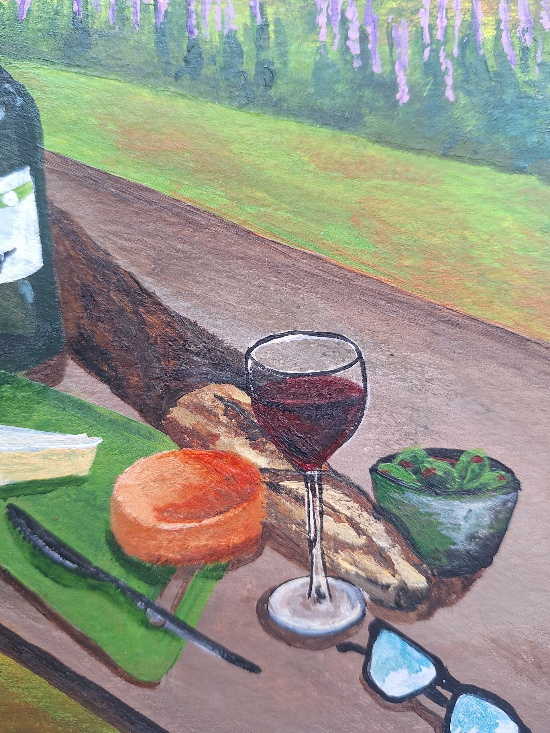 Wijn en kaas met bergen op de achtergrond.