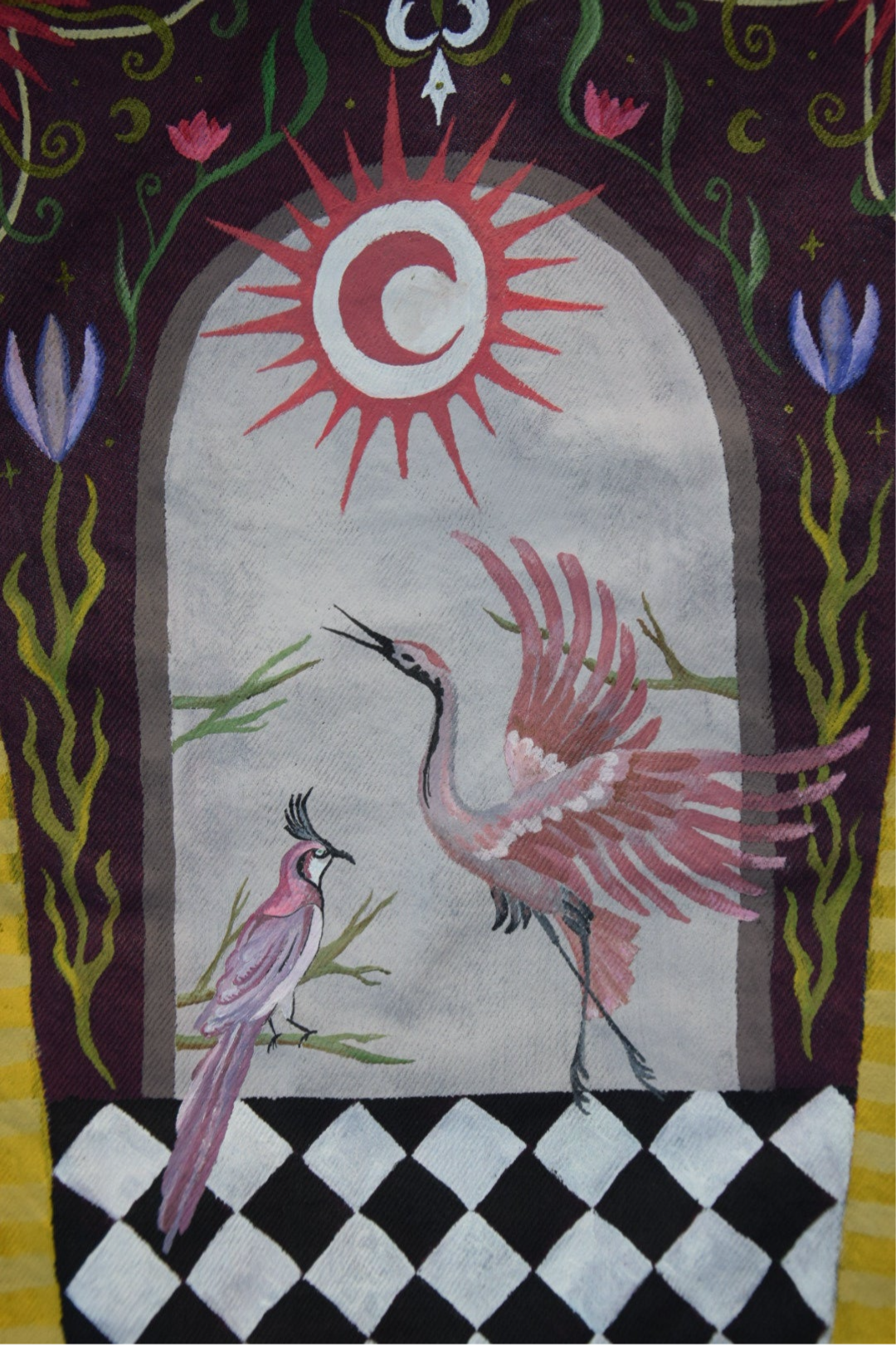 Het is geverfd met textielverf en is waterbestendig. Tips voor het wassen zie kopje wassen.