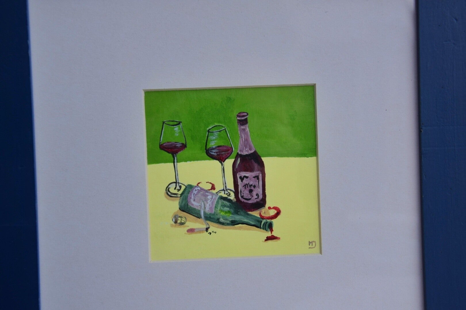 Het schilderijtje heeft op de achtergrond een groene en napels gele kleur. De lijst is donkerblauw.